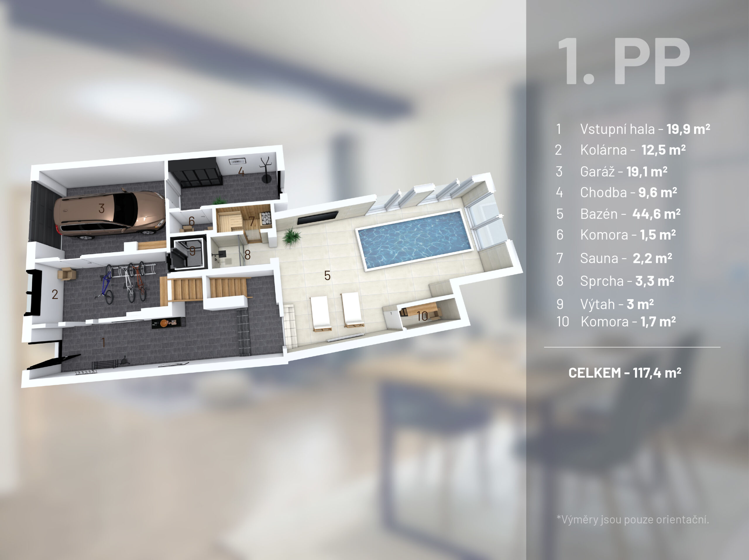 1. NP – garáž, šatna, výtahová šachta (příprava na výtah), příprava pro krytý bazén s barem, šatnou, toaletou a technickou místností