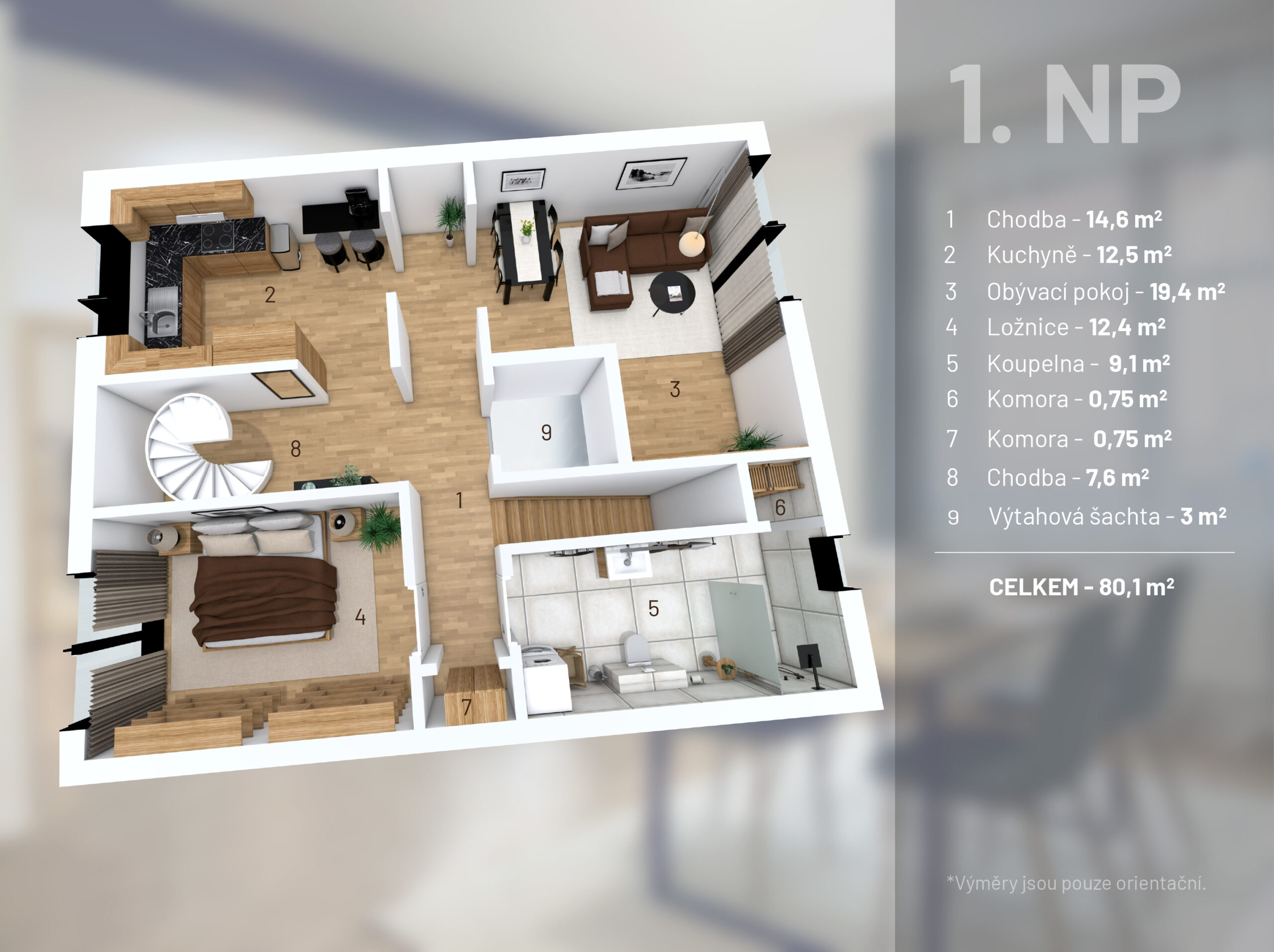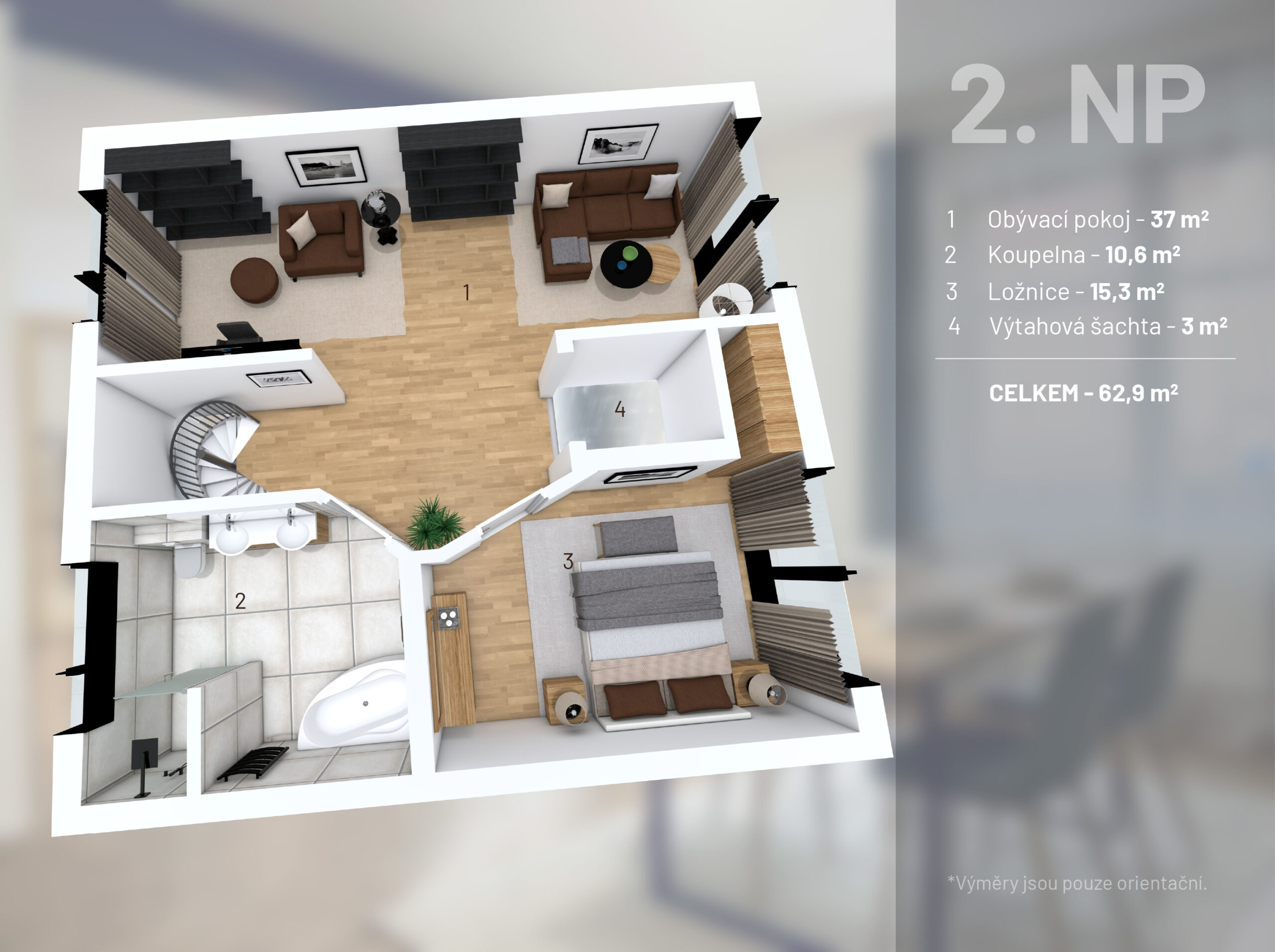 3. NP – kuchyň, obývací pokoj se vstupem na terasu, ložnice se vstupem na terasu, koupelna s toaletou a chodba